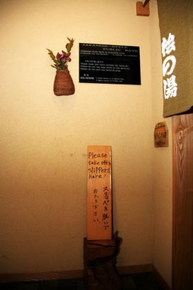 在浴室的入口处摆有手写的日语和英语的“入室请先脱下拖鞋”的牌子。