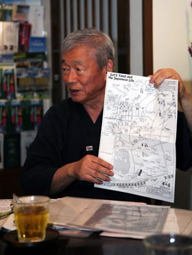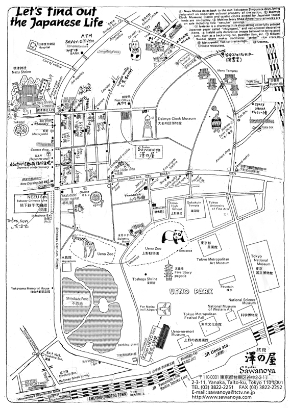 We participated in the Japanese Inn Group 32 years ago in 1980. At that time, guests could stay at Sawanoya for 7,500 yen per night, a room charge was 4,100 yen (now, it is 4,800 yen), and a dinner and a breakfast were 2,500 yen and 900 yen, respectively. However, the number of guests who have dinner had decreased because a dinner was expensive compared to a room charge or some guests did not have dinner for religious reasons. Therefore, we stopped preparing dinner. Instead, we have created a map of the Yanaka area in order to tell guests which restaurants can serve meals that suit their tastes. At first, we provided English-only maps, but those maps were not popular with our guests. Since Japanese names were not written on the map, when they visited stores, they could not tell whether English names on the map corresponded to actual store names. Therefore, I consulted with Mr. Okada at "Shalom Insatsu," a printing company, which has printed pamphlets of the Japanese Inn Group, and then walked with him around towns time after time, and created a map through which our guests can understand Japanese lifestyles and cultures. (continued in the upper right column)
