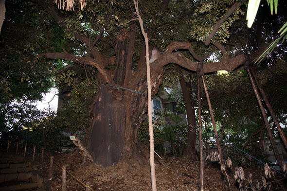 The large Japanese chinquapin (Castanopsis sieboldii) behind temple's main building is 9.5 meters high, and its trunk circumference is 5.63 meters. It is designated as a protected species in Tokyo.