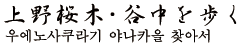 우에노사쿠라기, 야나카에는 많은 사원과 묘지 등이 있기 때문에 우에노노야마의 자연이 남아있는 귀중한 지역입니다. 에도시대의 무사저택의 흔적이 남은 골목 곳곳마다 초록이 보입니다. 이런 초록이 차분한 마을의 모습을 연출하고 있습니다. 우에노 공원 안에 있는 도쿄 예술대학과 도쿄도 미술관, 도쿄 국립박물관에 인접하고 일본 미술원도 있기 때문에, 예술가들이 살고 화랑이나 화구상도 있는 지역입니다. 문인과 화가, 음악가가 오가던 무렵에는 물감과 붓, 표구 등을 다루는 점포가 늘어서 있었습니다. 지금은 그 수가 줄었다고 하지만, 가끔 나타나는 점포나 화랑에서 마을의 흔적이 되살아납니다.