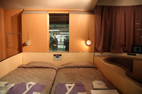 트윈 침대와 최후미의 넓은 전망창에 소파가 구비되어 있고, 가이세키 요리를 주문하거나 객실 내에서 샤워도 이용할 수 있습니다. 열차 끝에 있는 스위트룸은 1실 한정으로, 늘 예약이 차있다고 합니다.