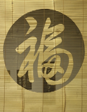 簾は一般家庭でも、このように用いると分かるように展示しています。また、掛け軸として特殊な物も作っています。本来は、天麩羅だとか鰻(うなぎ)だとか、文字を透かして抜く仕事が多かったのです。というのは、江戸時代の筆記具は墨だけでしたから、ペンキはありません。墨は濡れると落ちてしまいますから、それでこのように簾に透かして文字を描いていたのです。木彫看板や簾がそのような用途から用いられていました。簾の場合は、湿度があっても、乾燥しても長さが伸びたり縮んだりしないために、竹、それから葦(よし)材などが用いられました。