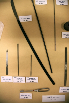 この長い鑢(やすり)は、刀の鞘を作る時に用いられる道具です。手術の時に骨を削ったり、特殊な鑢が多くあります。この人は、職人の中でもいわゆる絶滅危惧種の朱鷺(とき)だと言われています。それほど、貴重な業種です。