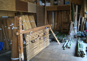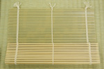 除了用竹子以外,還用蘆葦、鼠曲草、寬葉香蒲、胡枝子等編簾子。材料當然是有適合和不適合之說,最好根據用途選擇使用。比如把竹子劈開後來做成竹簽。因爲是竹子可以用刀削出適合的形狀。像做紫菜卷用的竹簾,卷的一邊作成平的,手握的一邊做成魚糕似的圓拱形,做鳴門卷和圓筒狀魚糕等鋸齒狀的東西時用三角形的簾子會比較適合。對于其他材料的話,幾乎都是在植物的自然狀態下直接拿來使用,不用像竹子那樣進行加工。胡枝子可以作出漂亮的顔色和光澤,但因其比較纖細都是彎著的,要把它用火矯直以後手感才會好。但是用火矯正過的東西一淋雨就不行了。