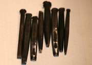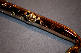 资产家有时会用纯金或银来制作家徽,而寺庙或神社,使用电镀铜或黄铜的比较多,镀金处理后使用。铜比较柔软,是雕刻图案还是弯曲处理都相对容易些。黄铜就比较硬,制作神兴只使用黄铜,如果用铜的话作好后会发黑,烟袋的制作也是用黄铜,最后渡上白金后。就会变得比较艳丽。银的话会比显得暗一些,白金或铬不会剥落。如今白金正逐渐成为主流,使用铬的话非常昂贵,精练时使用的水在扔的时候都要花钱,金在溶解的时候会冒烟,所以镀金店近来自己也不溶解金了,只用在市场买来的加工金材料,所以颜色也变的不一样了。