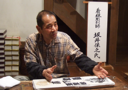 作为一种形式能够流传给后世是件非常令人高兴的事。比如说,将作品交给给客人后经过了几十年,一个偶然的机会在某个地方,我的儿孙们看到我或者祖辈们的作品,并且当他们知道那是自己的父亲或者祖父雕刻的作品时,那该是何等的心情啊。如果说到我父亲(师傅)留下的最令我记忆深刻的事情是什么的话,那应该是岩手县盛岗的八蟠的匾额了,那是由几位东京人捐赠的。以前在我偶然去到那里的时候,发现有象是出自我父亲之手的作品,仔细一看竟然发现上面留着父亲的名字。按照时间推算,那应该是在他刚刚独立出来的时候的制作的作品。看着它让我一下子想起了父亲,我不由得拿现在的自己去联想父亲当时努力工作的情景。就象这样,父亲的工作态度现在仍然通过作品这样一个特定的形式留存于世,这难道不就是能传给后世的招牌的魅力所在吗。把自己的思想雕刻进作品里,并将其作为一种形式保留下来,能看到大家使用它的情景,这就是那种使人乐在其中的境界吧,确实是件令人高兴的事。