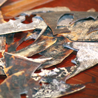 以前没有机器,研磨都是用鹿皮,要花很多时间去研磨。粘合时好像用的是蛋白。用熨斗代替火盆,一边调节热度一边进行粘合。最近饰物中的别针、垂饰、项链等西洋特色的产品比较受欢迎。至于书签和裁纸刀,只是想到哪做到哪而已,只要有订单什么都可以做,到现在为止做过的还有整理胡须的梳子和香盒、念珠等。