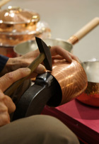 最近,一般人会认为那些明晃晃的才是铜制品,认为橙色的制品不太会是铜作的。这让我们这些制作的人感到很无奈。我们都不知道自己为什么去花功夫去做出这样的效果。所以,最近大家都做成明晃晃的了。只是在日式房间里使用的铜器,我们会注意做成比较内敛一些的,不是那么刺眼的颜色。