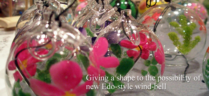 Shinohara's grandfather taught Yoshiharu, a father of Shinohara, how to make glass wind-bells. The wind-bells have been made since the Edo Period, so the wind-bells are called "Edo-style wind-bell." Now, only two shops, "Shinohara Furin Honpo" and "Shinohara Maruyoshi Furin" have been making Edo-style wind-bells. Wind-bells have their roots in China. It is said that they evolved from a tool hung from bamboo, which was used for telling a fortune by wind directions and its jingle.