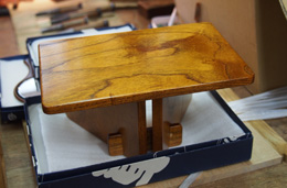 Edo-style cabinetwork is made with mortise and tenon joints without using metal fittings such as nails. Specialized cabinetmakers have appeared since the Muromachi Period. Edo-style cabinetwork is stylishly made, bringing out grain of wood such as mulberry and paulownia, while elegant Kyto-style cabinetwork is varnished with lacquer. Especially, Mulberry-wood from Mikura Island near the Izu Peninsula is valuable because it has beautiful glossy grain, and craftsmen who can obtain and process the wood are few in number. Products made of Mulberry-wood from Mikura Island get tanned as time goes by, and come to fit comfortably in user's hand. The image (above) shows a stool made by a technique called "Aibiki." Legs of the stool can be removed, so it can be put into a flat box. Heads of schools of Kabuki buy the stools in bulk because samisen players use it.