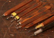 この鑿(のみ)も、最初にきちっとした物を買ってきたんですけど、自分で研いで形をわざと変えてるんですよ。よく見ると刃先が丸くなっているのもあるでしょ。私の場合は、丸みをつけないと彫る時に角がひっかかるんですよ。全部の鑿(のみ)に少し丸みがついてるんです。