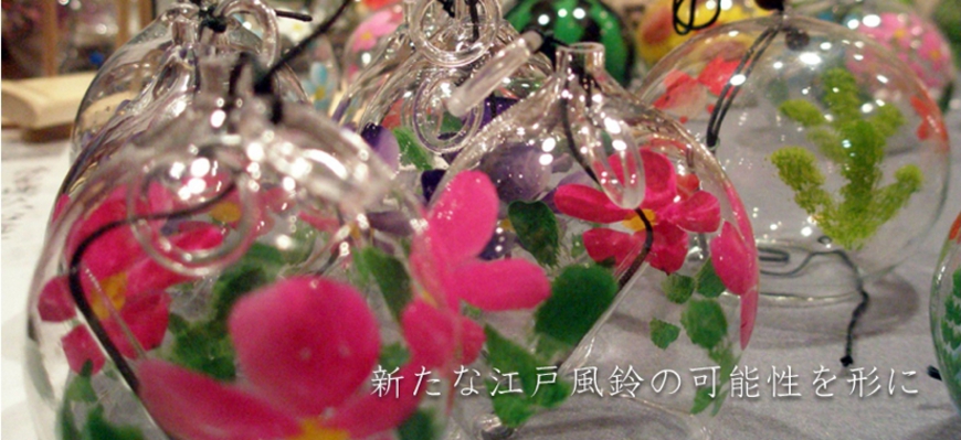 篠原さんの父儀治さんが先代から受け継いでガラス風鈴が江戸時代から作られていたことから「江戸風鈴」と名付けています。現在、江戸風鈴を製作するのは「篠原風鈴本舗」と「篠原まるよし風鈴」の2軒のみ。風鈴の起源は中国にあり、竹林に下げて風の向きや音の鳴り方で物事の吉凶を占う道具が進化したものと伝えられています。