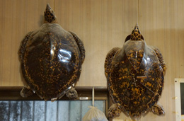 べっ甲の材料であるタイマイは、ワシントン条約(平成6年(1994)公布)により輸入禁止となったため、べっ甲師はみな手元の材料で賄っています。このように飾り物となっているタイマイは、質が悪くべっ甲に使えないため剥製となった場合がほとんどとのことです。