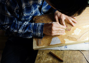 浮世絵だと元は筆で描いた線ですから強弱があります。この筆で描いた感じをうまく出せるように注意を払います。人物画では、顔の線や鼻の線、あとは髪の生え際ですね。すっとした綺麗な線で一気に顔の線などは彫らないといけないので気をつけています。