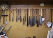 たんす屋の道具はあまり多くはありませんね。鋸(のこぎり)など何本も同じ道具が掛かってますね。鉋は、基本的には5、6台です。他には機械で厚みの調整などをします。片面を火であぶって歪み直しをします。機械は正確ですから、使えるものは使ってというようにしています。組み立ては手作業で、部材などの下作りは、ある程度機械を使っています。