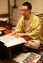 들으러 가기도 합니다. 문자만을 배우는 것이 아니라 그 세계(요세, 센샤)에 몸을 담고 역사와 문화를 배우고, 피부로 느껴야만 살아나는 문자라고 배웠습니다. 인연이 닿아 우에노 스즈키 연예장의 전단, 관람권, 팸플릿 등의 인쇄물을 만들고 있습니다. 만담회의 준비에 참여할 때는 메쿠리(공연순서안내)를 쓰거나, 당일 공연 순을 즉석에서 쓰기도 합니다. 그 공연순을 휴대전화로 촬영하는 사람도 있거든요.