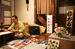 츄오구 미나토마치에서 태어나고 다이토구 마츠바쵸(현 마츠가야)에서 자라서 어릴 때부터 여러 장소나 장면에서 에도 문자를 봤습니다. 신사나 사찰에 봉납 된 부적이나 축제 의상의 글자 등을 보면서, 직접 쓸 수 있으면 좋겠다는 생각을 막연히 했습니다. 어떤 잡지에서 타치바나류 요세 문자 당주이신 타치바나 우키츠 선생님께서 교실을 열고 있다는 기사를 보고 바로 문의했지요. 그래서 제 스승이신 타치바나 우키츠 선생님의 교실에 입학하고 요세 문자를 배웠습니다. ‘센샤후다’도 좋아해서 동도납찰목(납찰 타치바나연)에도 입회하면서, 많은 회원과의 교류 덕분에 다양하고 오래된 에도 문자를 가까이서 접할 기회가 많아져서 더욱 직접 써보고 싶다는 생각을 하게 되었습니다.