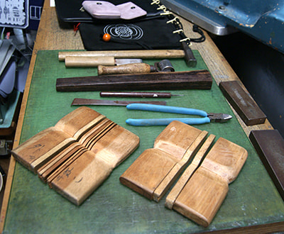 예를 들면 모서리를 이렇게 모으기 위해서 장인은 주걱을 사용합니다. 꽤 중요한 도구지요. 다른 것으로는 늘 사용하는 가죽 칼이 있는데 가죽에 틀을 놓고 재단하기 위한 도구입니다. 롤러도 마무리할 때 꽤 자주 사용하는데 붙인 곳을 눌러줄 때 사용하면 편리하지요. 예전에는 주로 망치를 사용했는데 붙일 때는 롤러가 균등하게 힘을 주기 때문에 좋습니다.
