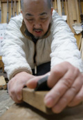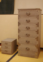 시간이 지나면 거무스름해지지만, 오동나무는 한번 밀어내면 깨끗해집니다. 다른 나무는 제작방법이 다르기 때문에 좀처럼 그렇게 할 수 없지요. 게다가 금속 못을 사용하지 않기 때문에 조립한 후에 한 번 더 밉니다. 금속 못을 사용하면 조립한 후에 대패를 사용할 수 없지만, 오동나무장에는 모두 나무 못을 사용하기 때문에 못을 박은 다음에도 밀어낼 수 있습니다. 100년이 지난 수리도 아직까지 주문이 들어오지요.