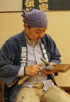 이렇게 태운 다음에 색을 입히는 작업을 ‘지다이시아게’(시대 마감)이라고 해서 다른 공방에서는 ‘야키기리’ 등의 호칭으로도 불리지만 도쿄에서는 저희가 원조입니다. 이 명칭은 악기인 거문고에서 유래한 것인데, 원래 거문고를 제작할 때는 그을려서 합니다. 그 점에 착안해서 조부가 처음으로 장롱을 버너로 그을리고 여러 가지를 궁리하면서 시도했지요. 이런 지다이시아게라는 마감 기법은 전후부터 시작해서 5,60년 정도 되었습니다.