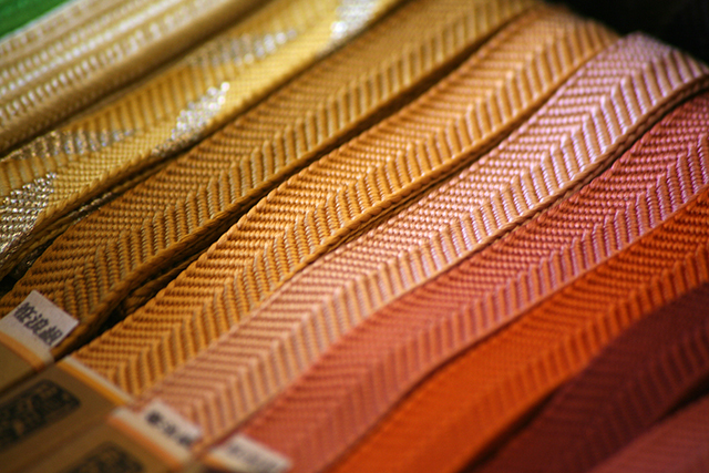 組紐是用真絲爲材料編成的,將撚上勁的真絲線利用編制台進行手工編制,編制台有方台、圓台、高台和绫竹台等,也有不使用編制台只用手來編的庫太組紐,庫太組紐的編制原理奠定了編組紐的雛形,是最初的編制技法。在正倉院和法隆寺中保留著據說是奈良時代制作的奈良編、笹浪編、唐編、安田編等組紐。一根和服帶締大約需要編2天的時間,如果是複雜一些的,則需要編3至5天,要是照原樣編古式組紐,甚至需要花上1周或幾個月的時間才能完成。(照片是笹波編的制品)