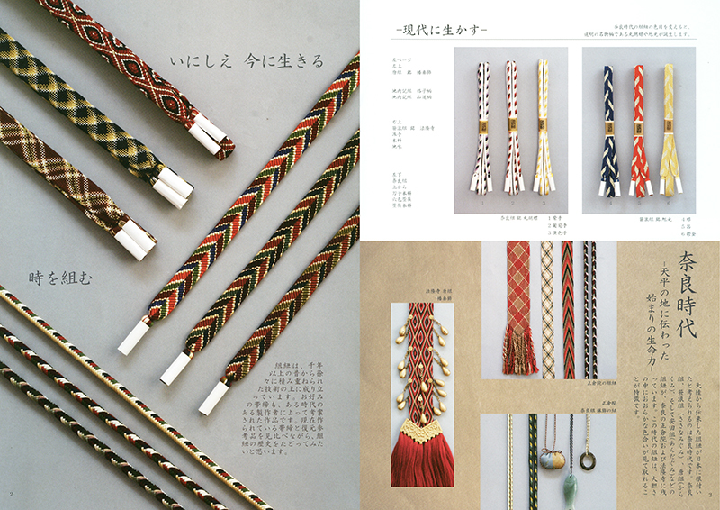 从中国传来的组纽编制技法在日本落地扎根,到奈良时代得到普及,经过平安、镰仓·室町、再到江户时代,对组纽传统的发展历程进行调查,并编制再现古代的组纽制品。