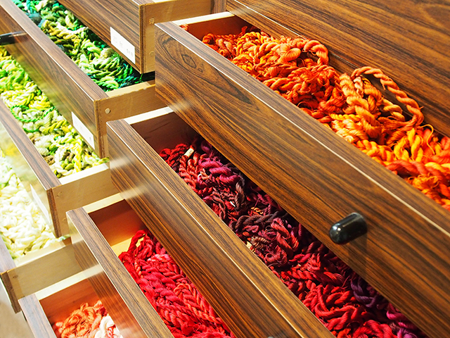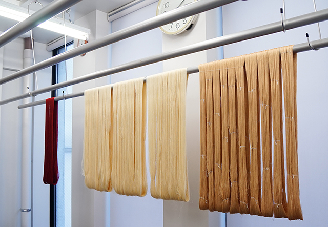 在店铺中挂着许多和色(日本传统色)丝线,仅和色中的素色就拥有180个色阶之多。