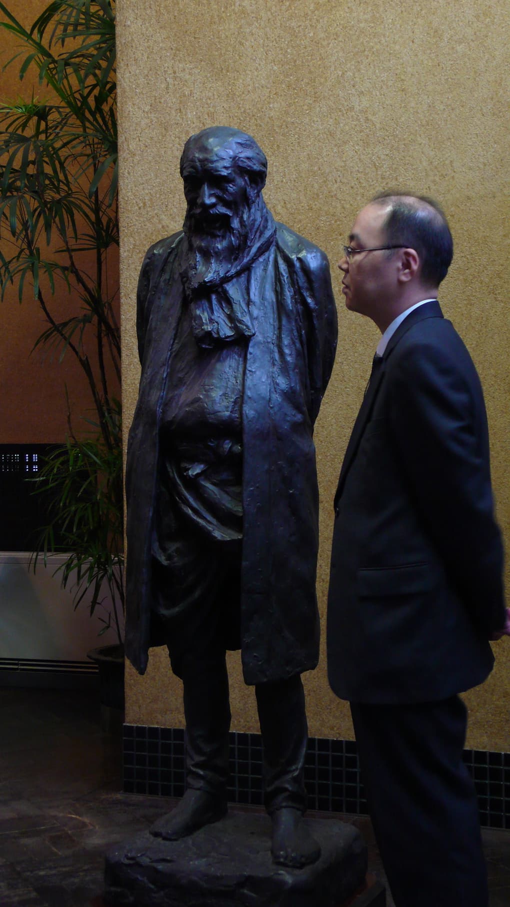 Asakura created many portrait sculptures. It is said that he created about 500 to 600 portrait sculptures, most of which were commissioned. The statue of Okuma is one of them. Asakura had great skills, so it was marvelously created. However, there are two types of sculptures, artistic sculptures that he creatively made and other sculptures that he just made because they were commissioned. In this sense, the statue of Okuma is one of the most excellent portrait sculptures, which has profound expressions. It is not just a copy of a form or facial expressions, but a pure representation of an object or person, which I think is one of difficult aspects of making sculptures. A portrait sculpture of a living person, in particular, has to contain his/her past and future in it. For example, a two-hour play in which an actor acts decades of a person's life is produced through some kind of abstraction. However, a sculptor should create a sculpture that contains a model's past, present and future. It is not just a building up of a form. In this sense, the statue of Okuma is a sculpture that embodies the above explanations. Moreover, this is not just a standing statue. There were many difficulties when it was created. Please look at the balance and the pose. It does not just stand straight, but is slightly twisted making movements throughout the body. Asakura created this statue while considering how the body moved and stood behind the coat. This is one of the most successful examples of such a creative process. I think four statues displayed here were also successfully created following such a creative process. I think, in particular,
