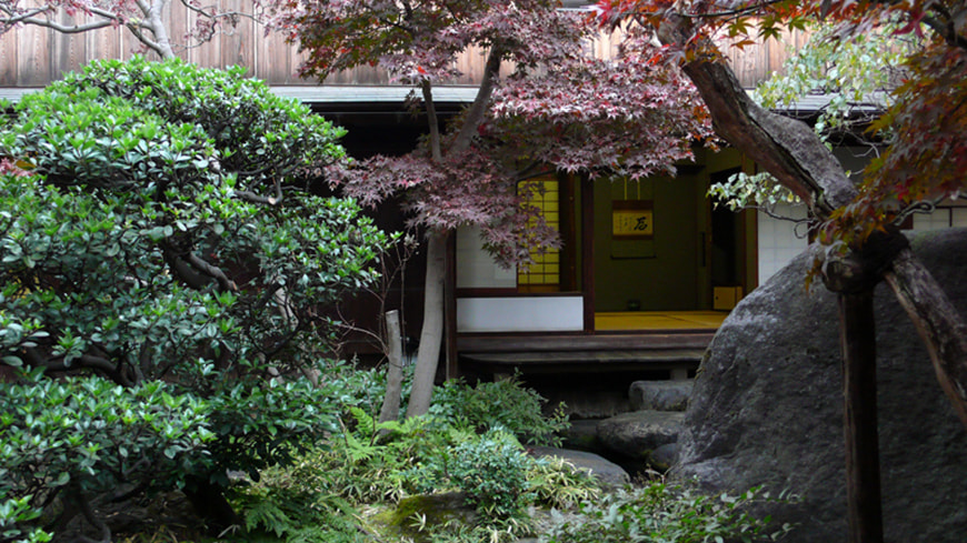 Rocks representing the five Confucian precepts benevolence, justice, propriety, wisdom and fidelity are placed in the Goten-no Suitei water-garden. The teahouse-style, Japanese building facing the garden has a Western-style drawing room, where guests from overseas were entertained, and Japanese-style tearoom and Asakura's room, creating a harmonious atmosphere in which Japanese and Western elements coexist. In the garden, a red-flowered crape myrtle is planted among white-flowered plants.