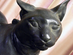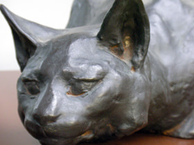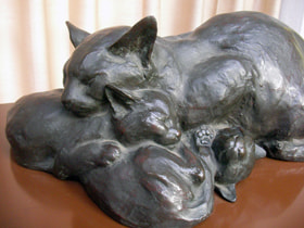 朝倉文夫の作品を大きく分けますと、肖像彫刻がもっとも大きな部分を占めています。そして、もうひとつは展覧会に出品した創作作品です。等身大の男性像であったり、女性像があります。そしてもうひとつは展覧会に出品していますが、どちらかというと朝倉が本当に作りたかったものと言って良い、それがこれらの猫の作品かと思います。肖像彫刻はやはり注文がありますから、まず似ていなくてはいけないというような条件があります。創作は、特に若い時には賞を取らなければいけない、代表作という気概で出品しなくてはならないと、やはり背負うものがあります。けれども、これらの猫の作品では、そのような気負いがなく、写真も残っていますが、朝倉は猫が大好きで、10匹以上の猫を飼って、猫の動きというのはなんて美しいのだろうと、また猫が人の言う事を聞かないところも含めて、猫の気ままなところも好きだ等と言ってます。作品から、そうした気持ちが自然とすっと入っている、肩の力が抜けている、そこがかえって表現を自由にしていると思います。