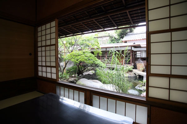 The courtyard is composed of five massive rocks and a pond filled with well water. Although the space is small, a concentrated atmosphere can be felt in the limited space of the courtyard that are surrounded by the buildings. 17 large trees and 13 species of shrubs are planted.