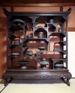 Copper utensils, which Asakura collected when he visited the Southeast Asian countries, are placed on the display cabinet.