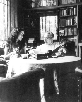 書斎には恩師である岩村透の旧蔵書や朝倉の蔵書があります。ここは制作の合間にリラックスする場でもあったのではないかと思います。残されている写真を見ましても、煙草をくゆらせていたり、コレクションを眺めていたり、お嬢さんと談笑されている光景が見て取れます。また、書類が山積みになっていたり、書きかけのものがあったりする様子も写真に写っているので、ここで執筆活動等をしていたと考えています。(下段に続く)