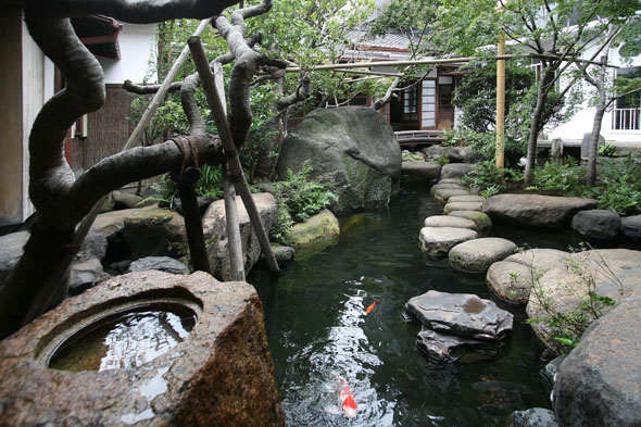 中庭の特長は、作庭の常識を破った深さを有した池と巨石が中心となっています。作庭の基本となっている平安時代に記された作庭記には、庭の池は淺かるべしとされているのですが、深くなると魚が肥り過ぎると言われています。元々谷中では湧き水があり、朝倉先生はこれを活かして設計されたのだと思います。最も深い所で2mを超えていますが、池に配されている飛び石の下はコンクリートでアーチ状になっています。この下を魚は回遊するようになっています。現在では鯉(こい)が20数匹、鮒(ふな)が180匹程おりましたが、朝倉先生の文集には、元々鯉は新潟から取り寄せられたと書かれています。(右上段に続く)