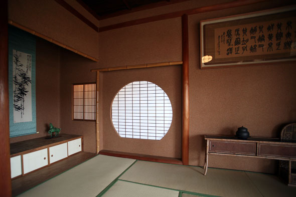 ピアノの間から中庭を望む。窓枠はアルミサッシからスチールサッシに復原されています。