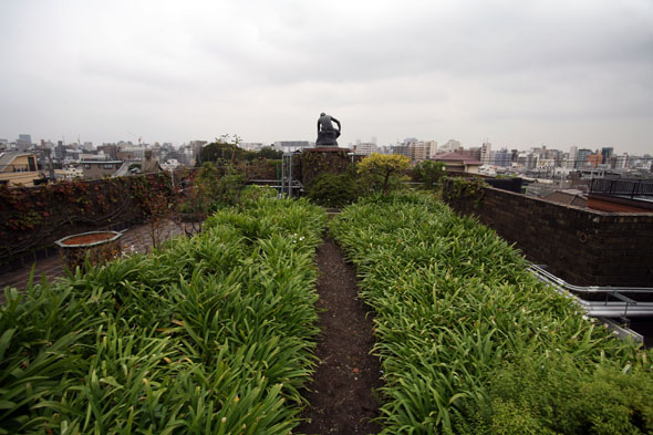 アトリエ棟の屋上には、作品が配置されています。像と眼下の谷中の家並みが、大きな空間を作り上げています。
