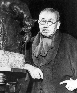 고양이를 모티브로 한 작품 「요쿠에타리」(잘 잡았다)를 앞에 둔 아사쿠라 후미오 (도록 「아사쿠라 조소관」 발췌)