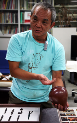 筱原教授親自為我們展示了鍛金技術的不可思議之處,隨著錘子巧妙的揮動錘打,銅板像具有生命的一樣隨即變形。從愛沙尼亞來的碩士研究生卡高拜勒•昂尼,在本國主要從事制作珠寶首飾。而歐洲比較有人氣的是木紋金(銀、銅、赤銅、黃金等層積接合後一邊削出紋樣,一邊敲打拉長的日本傳統技法)。很多人來到日本本土留學學習這項技術。現在在制作容器和裝飾品,珠寶加工和鍛金工藝上雖然從作品的構思上存在著差異,但從愛沙尼亞的時候起他就懷有始終不變的主題。日本和歐洲在表現上存在這不同,是件很有意思的事情。(下段繼續)