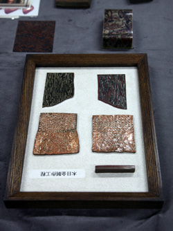 听筱原教授说,锻金技术分热加工和冷加工,前者是把铁烧红后进行锻造,后者是将退火后变软的铜板进行的冷加工挤榨技法。其他比较传统的还有着色法,就是用硫酸铜和铜绿的水溶液煮上颜色的煮色着色法,和把不同的金属板层积接合,一边削出纹样,一边敲打拉长的木纹金等技术。
