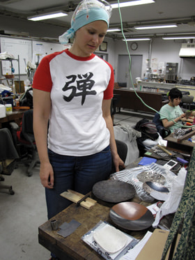 筱原教授亲自为我们展示了锻金技术的不可思议之处,随着锤子巧妙的挥动锤打,铜板像具有生命的一样随即变形。从爱沙尼亚来的硕士研究生卡高拜勒•昂尼,在本国主要从事制作珠宝首饰。而欧洲比较有人气的是木纹金(银、铜、赤铜、黄金等层积接合后一边削出纹样,一边敲打拉长的日本传统技法)。很多人来到日本本土留学学习这项技术。现在在制作容器和装饰品,珠宝加工和锻金工艺上虽然从作品的构思上存在着差异,但从爱沙尼亚的时候起他就怀有始终不变的主题。日本和欧洲在表现上存在这不同,是件很有意思的事情。