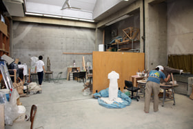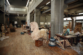According to Professor Fukai, students do not have quotas to fulfill, so they create works as many as they want. In the master's course, there is the Graduation Works Exhibition. Although students' works are exhibited at the University Art Museum and this studio, the museum's the exhibition space for sculptures is small, so students spend 1 year to create works which sizes fit into one room of the exhibition space. Large works that cannot be put in a building are exhibited outside or in front of the museum. Although each student belongs to a laboratory, students can use any studio regardless of their laboratories. Professor Fukai specializes in wood carving, and a variety of students ranging from juniors to doctoral students are enrolled in the wood carving course. The stone carving and metalwork courses also have various students. Students in the modeling course create works in graduate and undergraduate students' rooms. Although students receive practical training during the second semester of the second year for the first time, approximately 70 % of students use the same materials that they have used before. In Japan, since many students develop their ideas from materials, such an education system is adopted. (continued in the lower column)