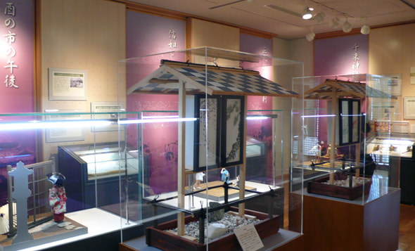 "Model of Tamagiku Toro" (created by Hiroshi Miura, right) -- "Tamagiku Toro" was an event in Nakano-machi, which comforted the spirit of "Tamagiku," a courtesan at a bordello "Nakamanji-ya" in Sin-yoshiwara Sumi-cho. Teahouses on both sides of the street placed this lantern in front of their houses. Tamagiku is said to have had both wit and beauty, and have been good at tea ceremony, flower arrangement, popular linked verse and koto music. She died at the age of 25 in 1726.