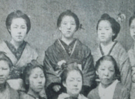 明治20年(1887)2月「萩の舎」発会記念写真、最後列左から3人目が一葉、第2列中央が中嶋歌子。(山梨県立文学館蔵)