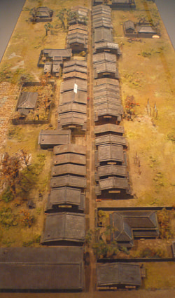 一葉の転居当時の明治26年(1893)頃の下谷龍泉寺町大音寺通り(現茶屋町通り)、中央の白地の札が見えるあたりが一葉宅。この町並みの手前に三島神社、通りの奥には新吉原へ続くはね橋がありました。(考証、上島金太郎・塩田良平・和田芳恵)