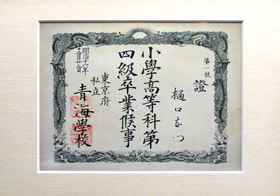 上野御徒町に転居後に入学した池之端の私立青海(せいかい)学校小学高等科第四級の卒業証書(明治16年(1883)12月)、首席で修了。(山梨県立文学館蔵)