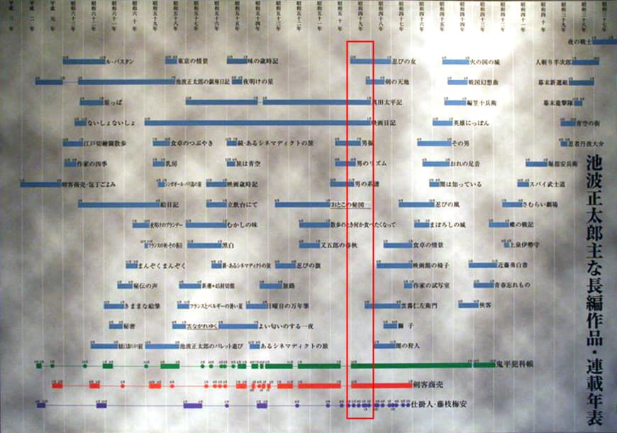 これは池波正太郎の主な長編作品・連載作品の年表です。これを縦に見ていただくと、例えば昭和49年(1974)ですが、49年のこの緑色の辺りは「鬼平犯科帳」ですね。そして「剣客商売」、「仕掛人・藤枝梅安」です。(右段に続く)