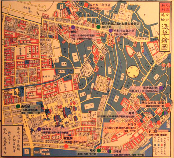 これが、大江戸絵図です。これが江戸の町全体ですね。ここが隅田川。ここに緑とか紫などの色んなマークが付いていますね。これは、鬼平犯科帳、剣客商売。仕掛人・藤枝梅安の舞台となっている場所を江戸図の中に落とし込んでいるんです。これが割合ご好評をいただいておりますね。