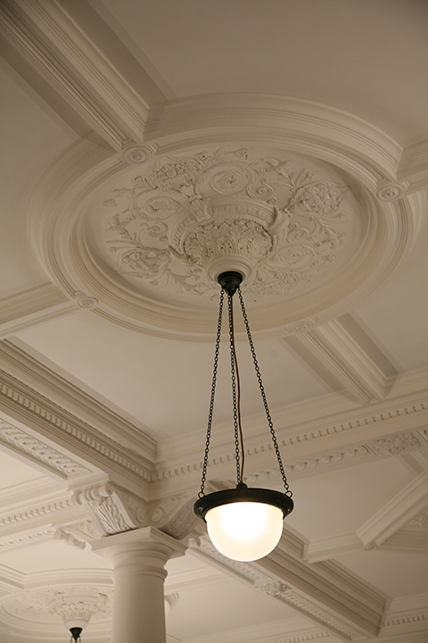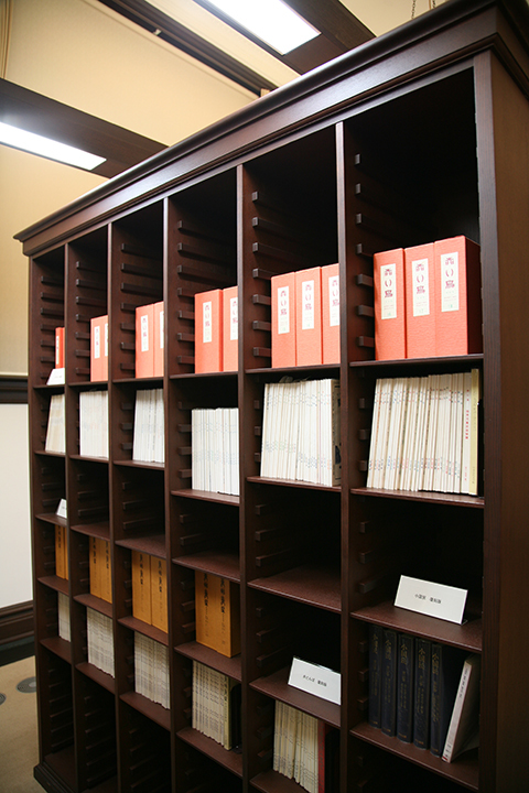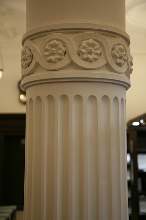少兒圖書展廊裏面的4根圓柱,柱芯是鋼骨外面包上被稱爲竹小舞工藝的細竹編,外施粉刷(注:竹小舞,將竹子切割成細條作成竹編)。柱頭裝飾部分,采用往石膏模具裏倒入石灰,在硬化前倒出來貼在柱子上的施工方法。天花板的裝飾是抹灰職人用抹子作成的拉毛粉飾,被稱爲“镘繪”也就是抹子畫。在修複施工中采用了與初建時相同的施工方法,當時的技術傳承開來。