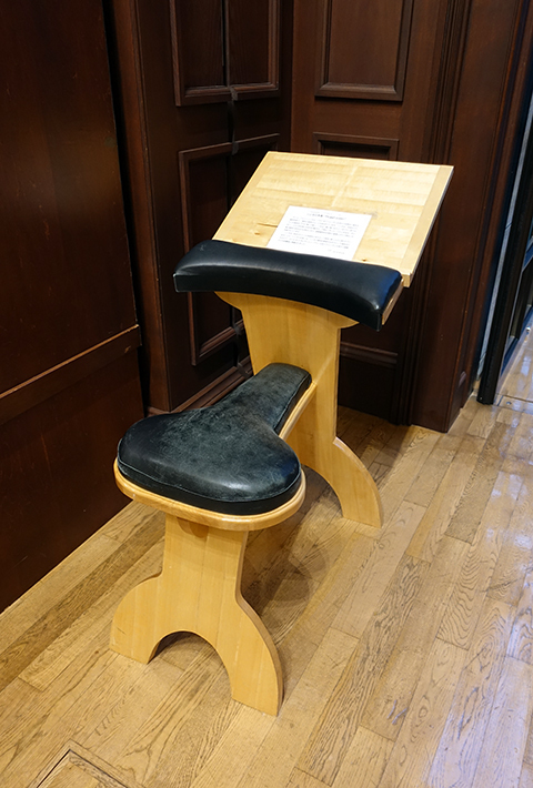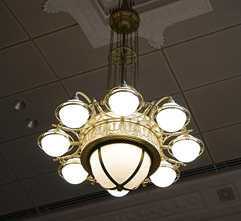 [世界知識閱覽室]是舊帝國圖書館時代的貴賓室,裏面的內裝格調最高,從未提供給普通民衆使用過,如今也都隨著國際兒童圖書館的開業一起對外開放使用,在牆面和天井的修複工程中,沿用了明治時代采用的貝殼灰、石灰、紅藻、滑稭等混合工法。其中的枝形大吊燈是測繪了在東京電力公司保管著的實物配件取得尺寸後,用黃銅制作並鍍金而成的。地面采用木拼花地板,淺色的木紋是榉木、暗茶色的是花梨木、黑色的是黑檀木,拼制的圖案漂亮又考究。
