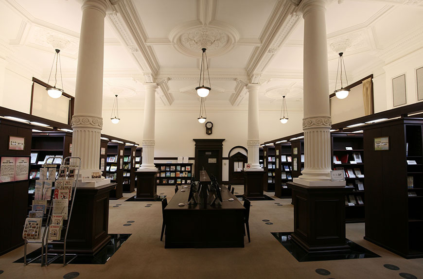The columns in the Gallery of Children's Literature are wrapped with "Takekomai," a bamboo structure wound into steel frames, and finished with plaster. The decorations of the columns are made by filling plaster into molds, removing the plaster before it hardens, and putting it on the surfaces. Also, the decorations on the ceiling are depicted by plasterers with trowels. The decorations were restored in the same method as those of at that time, and the technique was passed on to the next generation.